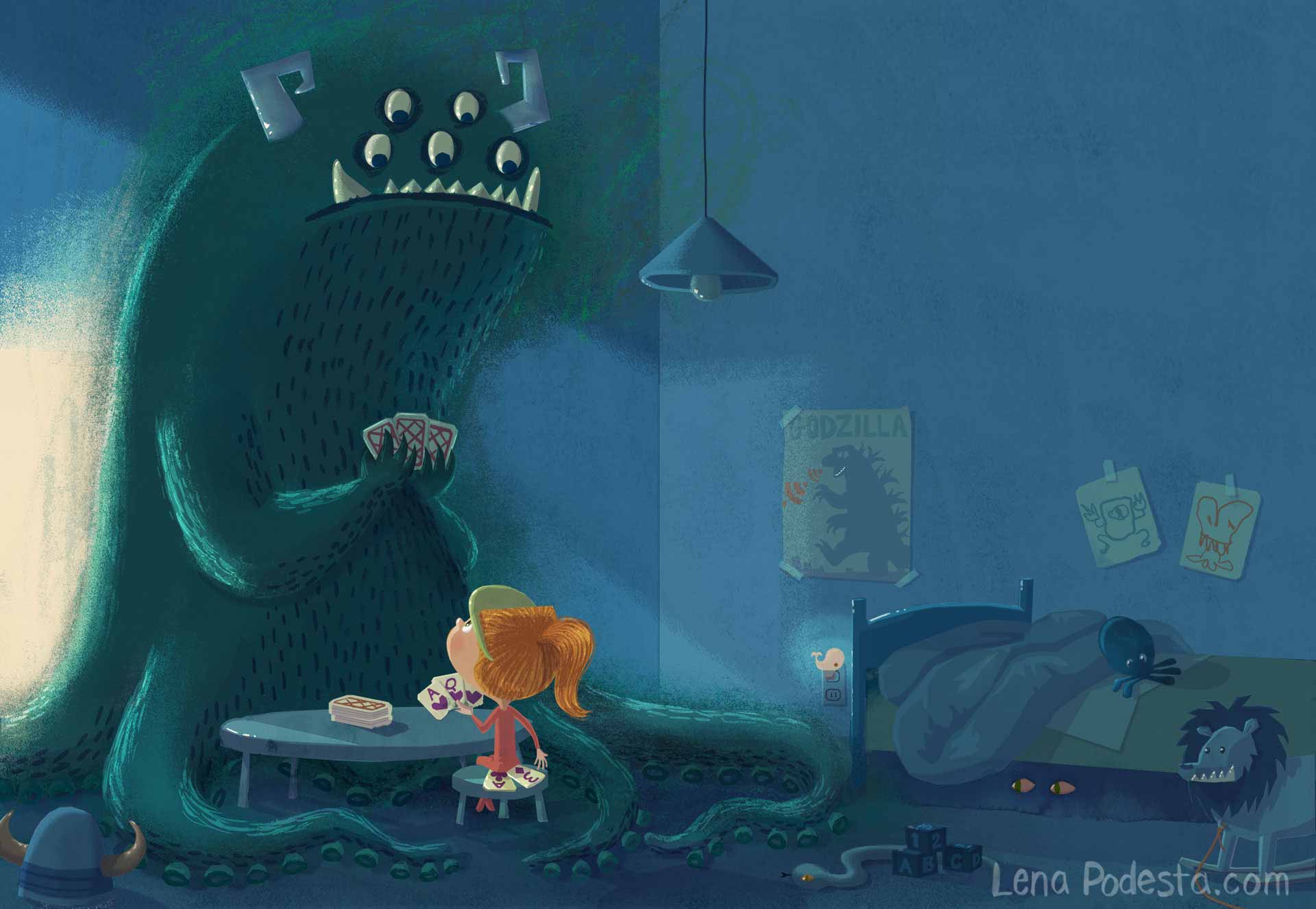 Once upon a time, Liz and I were working on this picture book idea. She wrote a really finny bit about a girl who liked to play poker with the monster in her closet. The picture book never came to be, but her idea inspired this illustration.