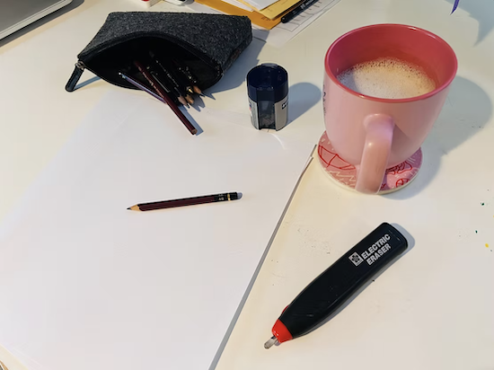 Keep paper, pencils, pens—whatever you like to draw with—right there. If your desk doesn’t have drawers, keep supplies in a small box clearly labeled “Keep Out. Mine.” That way, when you have 15 or 30 minutes, you’re ready to draw immediately. No setup. No excuses.